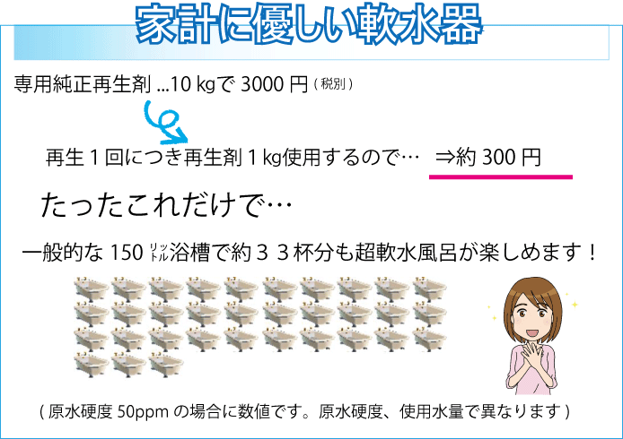 *特殊シャワーヘッド(節水タイプや浄水タイプ、ミスト等など・・・)をご使用の場合は水圧や使用製品により、軟水器が正常に機能しない場合がございます。お買い上げ前にご相談ください