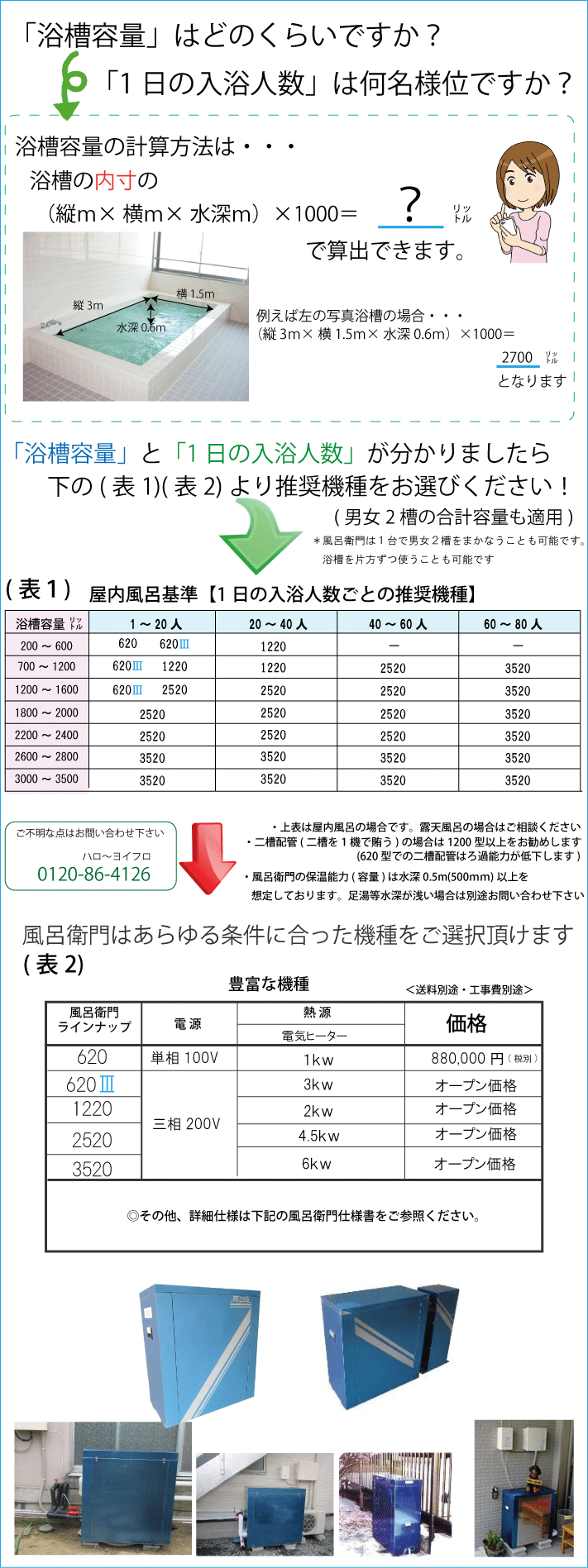 | 型式 | 風呂衛門620 | 風呂衛門1220 | 風呂衛門2520 | 風呂衛門3520 |